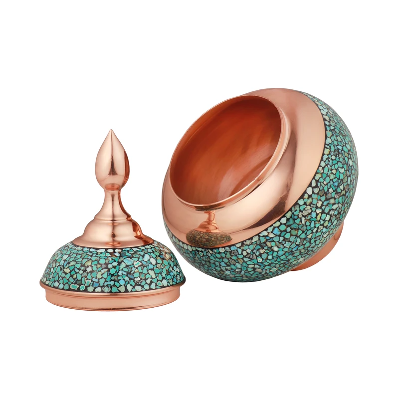 - تزئینات فیروزهای: درخشش آبی روی بدنه مسی، جلوهای بینظیر خلق میکند